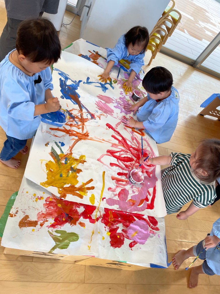 折り紙や画用紙、絵の具、クレパスなど様々な画材を用いて、季節や行事にちなんだ製作や絵画に取り組みます。指先を使った折り紙・絵具を全身で使ったボディーペインティングなどなど。決まった型にとらわれず、一人一人の自由な表現力や創造力を養います。