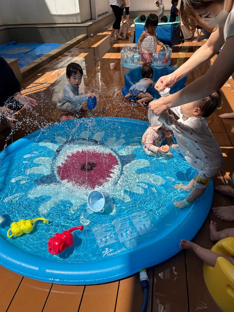 夏場にはウッドデッキで水深の浅いプール、噴水の出るプールなどで、楽しく水遊びを行います。大はしゃぎのこども達は暑い夏でも元気に過ごしています。